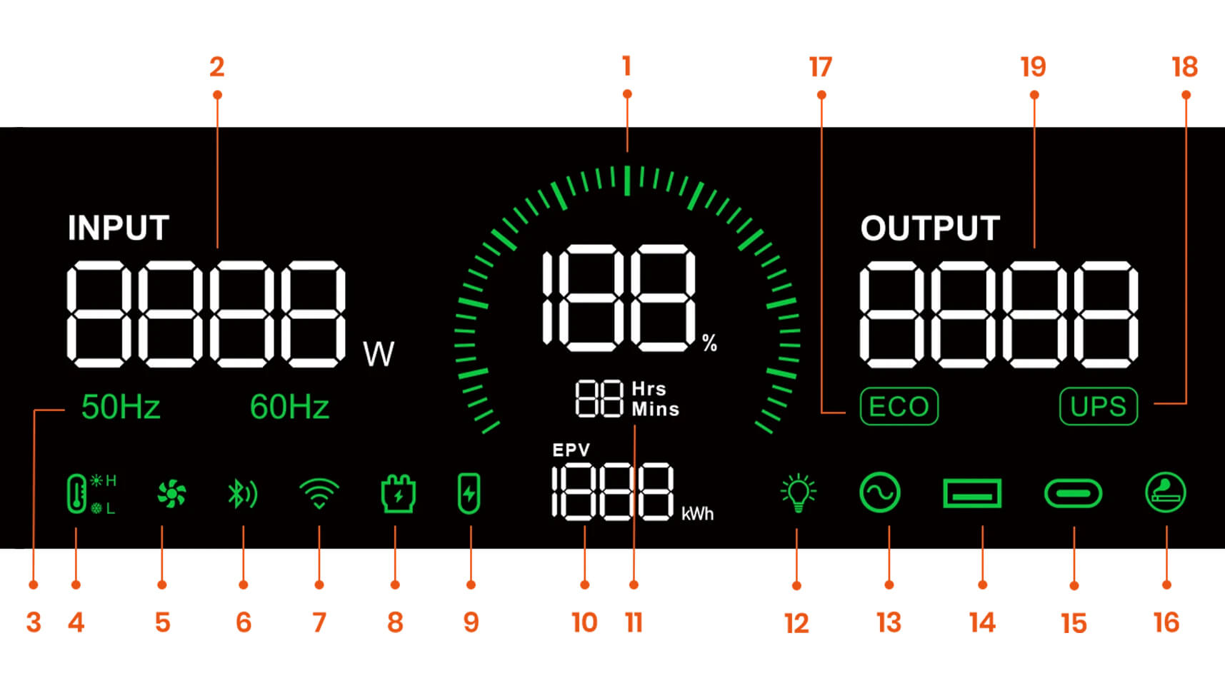 Станция имеет дисплей, показывающий, как долго электростанция может поддерживать работу ваших электроприборов. Отображается вся необходимая информация. Уровень заряда в процентах и часах. Мощность входного потребления, то есть зарядки. Выходное потребление в ваттах. Индикация активных портов, например USB или розетки 220 В. Также можно видеть активную частоту AC, работу охлаждения и перегрева, если таковой произойдёт.
