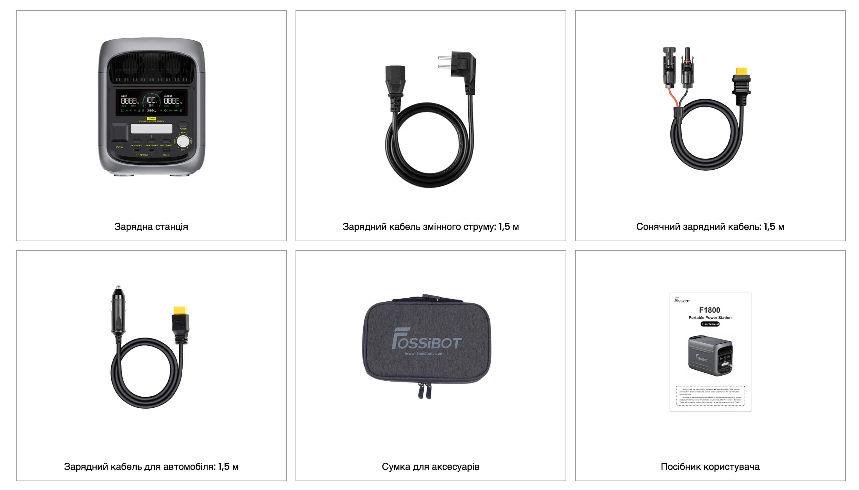 В комплект к зарядной станции входит: 1. Электростанция Fossibot F1800 / 2. Кабель для зарядки от сети переменного тока / 3. Кабель для зарядки от автомобильного прикуривателя / 4. Кабель для зарядки от солнечных панелей / 5. Чехол для хранения кабелей / 6. Руководство пользователя.