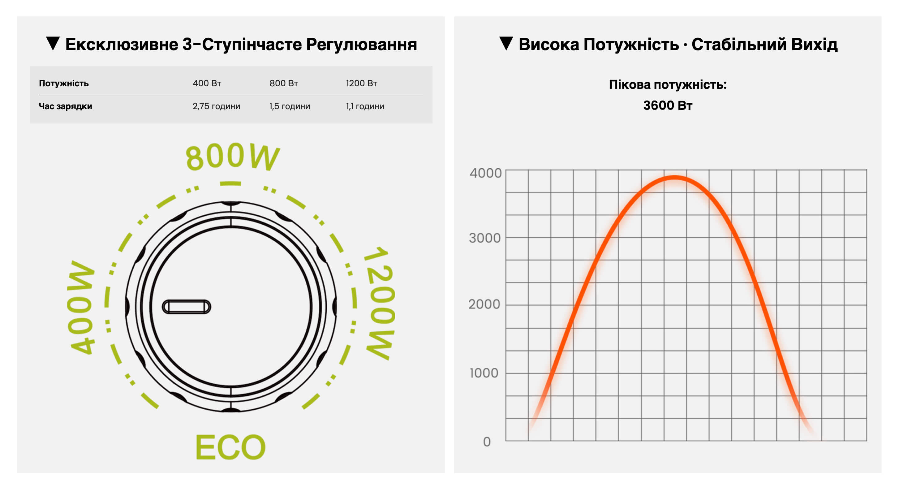 На корпусе зарядной станции расположен регулятор, позволяющий изменять потребляемую мощность зарядки в диапазоне от 400 до 1200 Вт. Переключатель с тремя фиксированными позициями управляет работой внутреннего AC-DC преобразователя, задавая ограничение тока на входе. Это даёт возможность адаптировать режим зарядки под доступную сеть или под конкретные требования пользователя. При максимальном уровне входные 1200 Вт обеспечивают полное заполнение за 1 час 10 минут. Снижение до 800 Вт увеличивает цикл до 1 часа 30 минут, а 300 Вт обеспечивают полный заряд за 2 часа 45 минут. Такая гибкость позволяет безопасно заряжать станцию от слабых или перегруженных линий, избегать срабатывания автоматов и выбирать скорость, необходимую в конкретных условиях.