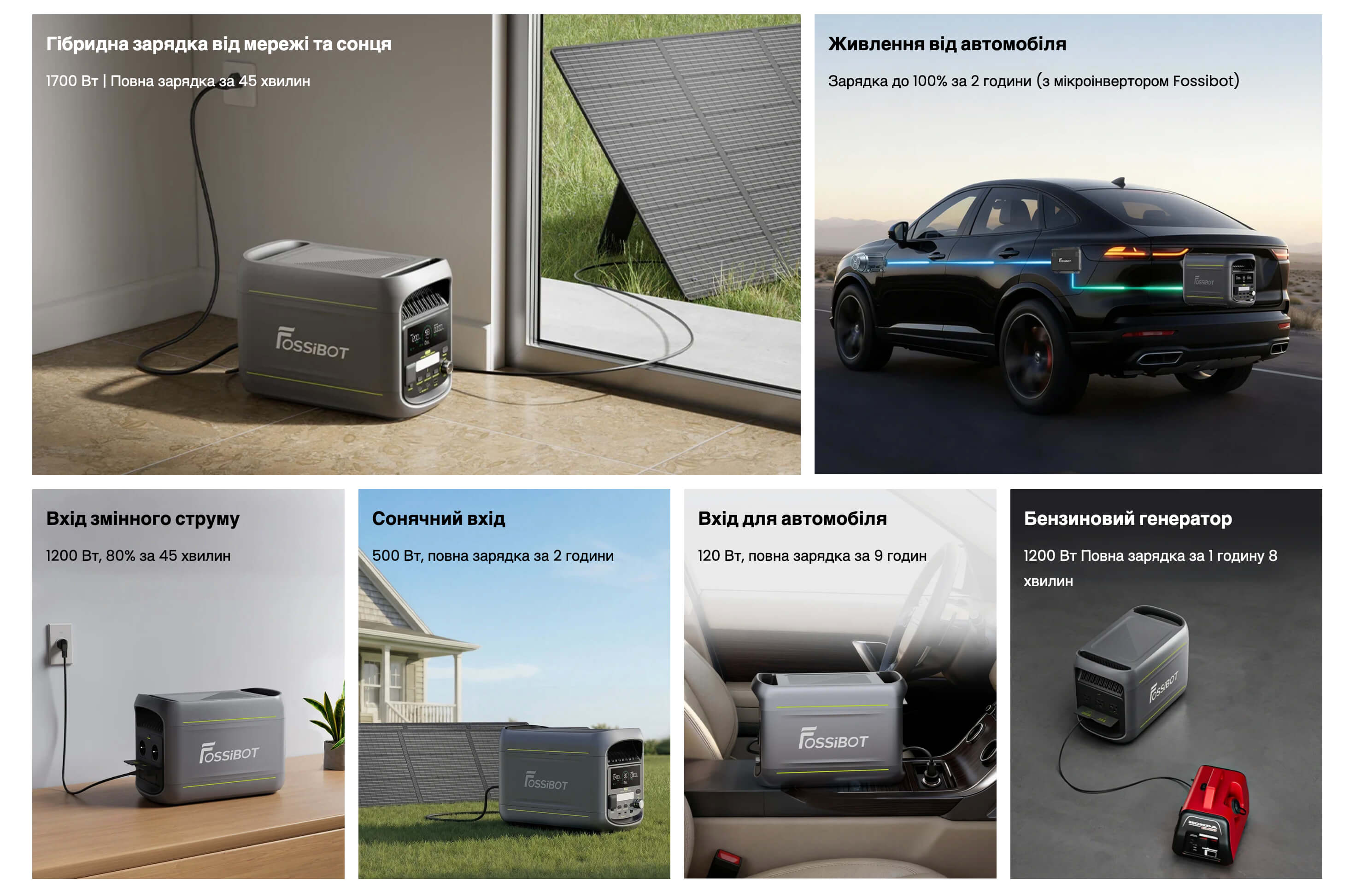 Мережа змінного струму - 220В 1200 Вт, 50 Гц; Порт для сонячних панелей або зарядки від автомобіля - 200 Вт; |