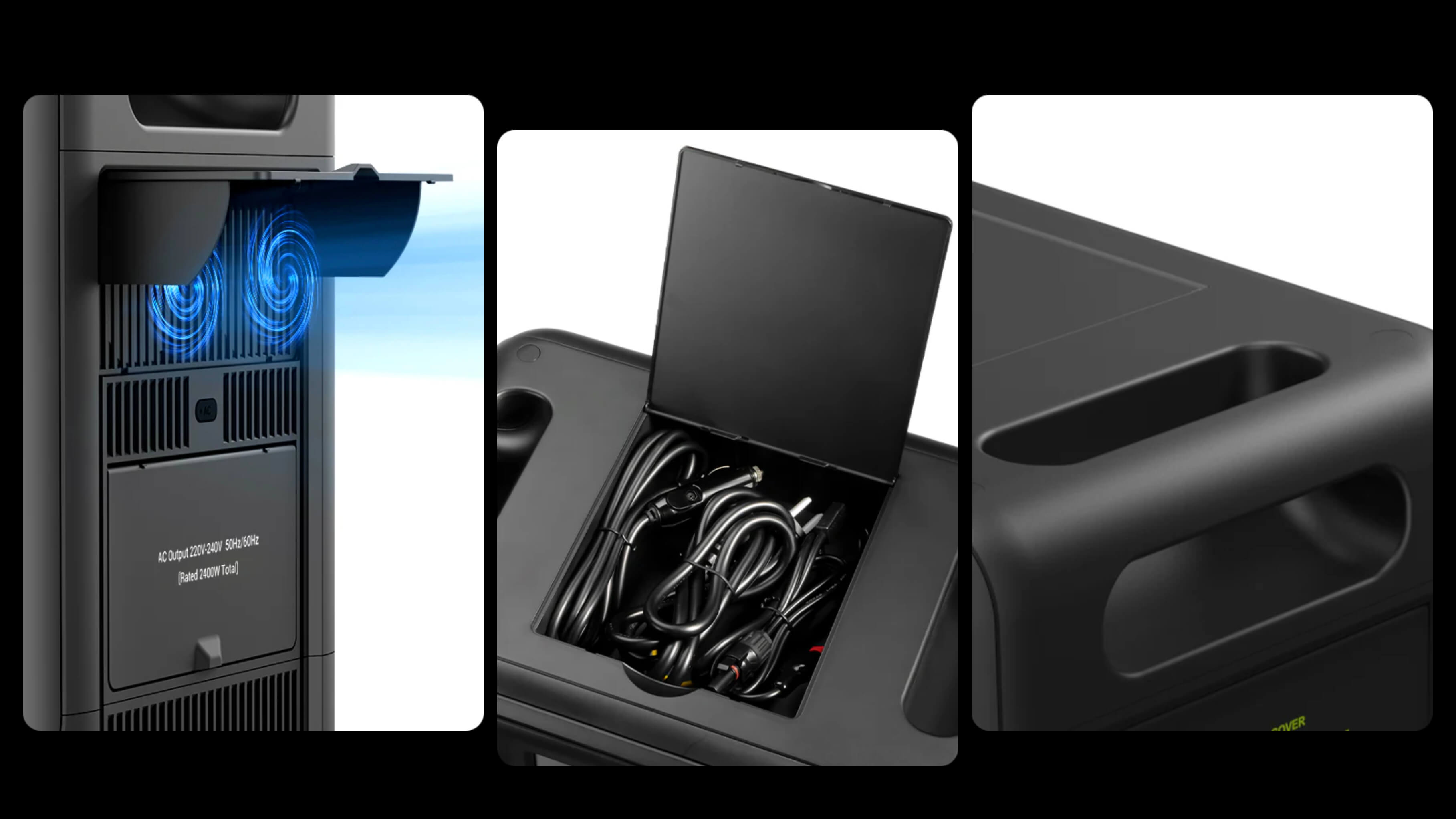 Параметры выхода: 3 порта переменного тока 2400 Вт (220 В); 2 порта USB-A QC 3.0: 5-12 В 18 Вт; 3 порта USB-C PD-20 Вт 5-20 В; 1х порт USB-C ПД-100 Вт 5-20 В; 1х ХТ60 12 В 10 А; 1х прикуриватель 12 В 25 А; 2x DC5521 12 В 3 А;