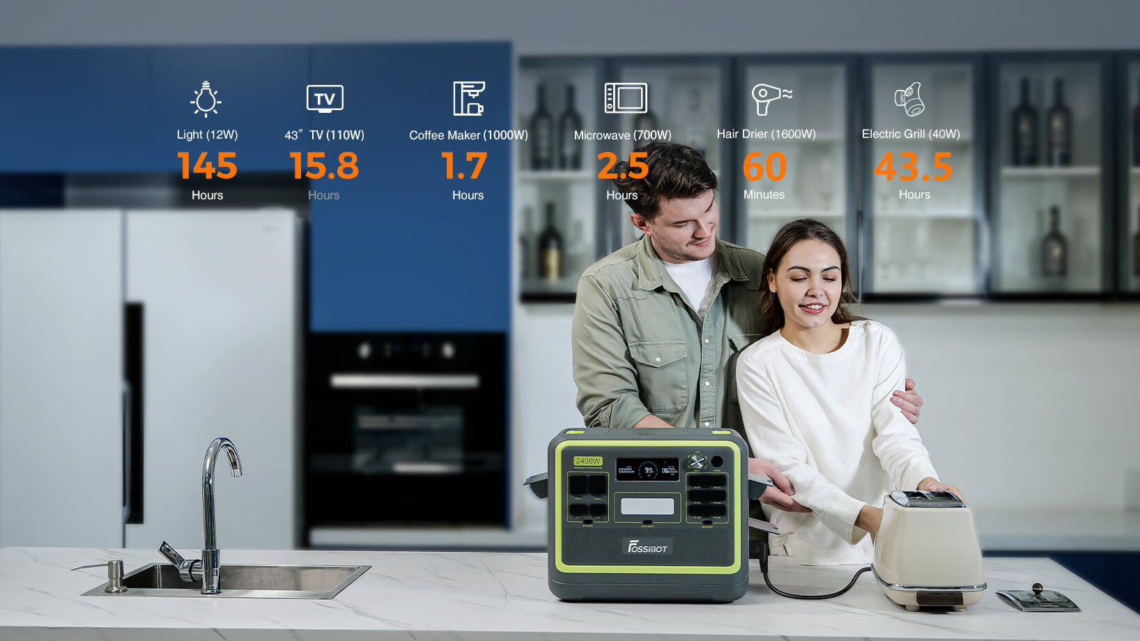 Защита хрупких электрических изделий от любого сбоя питания с помощью Fossibot F2400. Зарядная станция может работать в режиме источника бесперебойного питания (ИБП), предназначенного для защиты чувствительных и ценных электрических устройств. Данный режим работает в пределах 1440 Вт нагрузки.