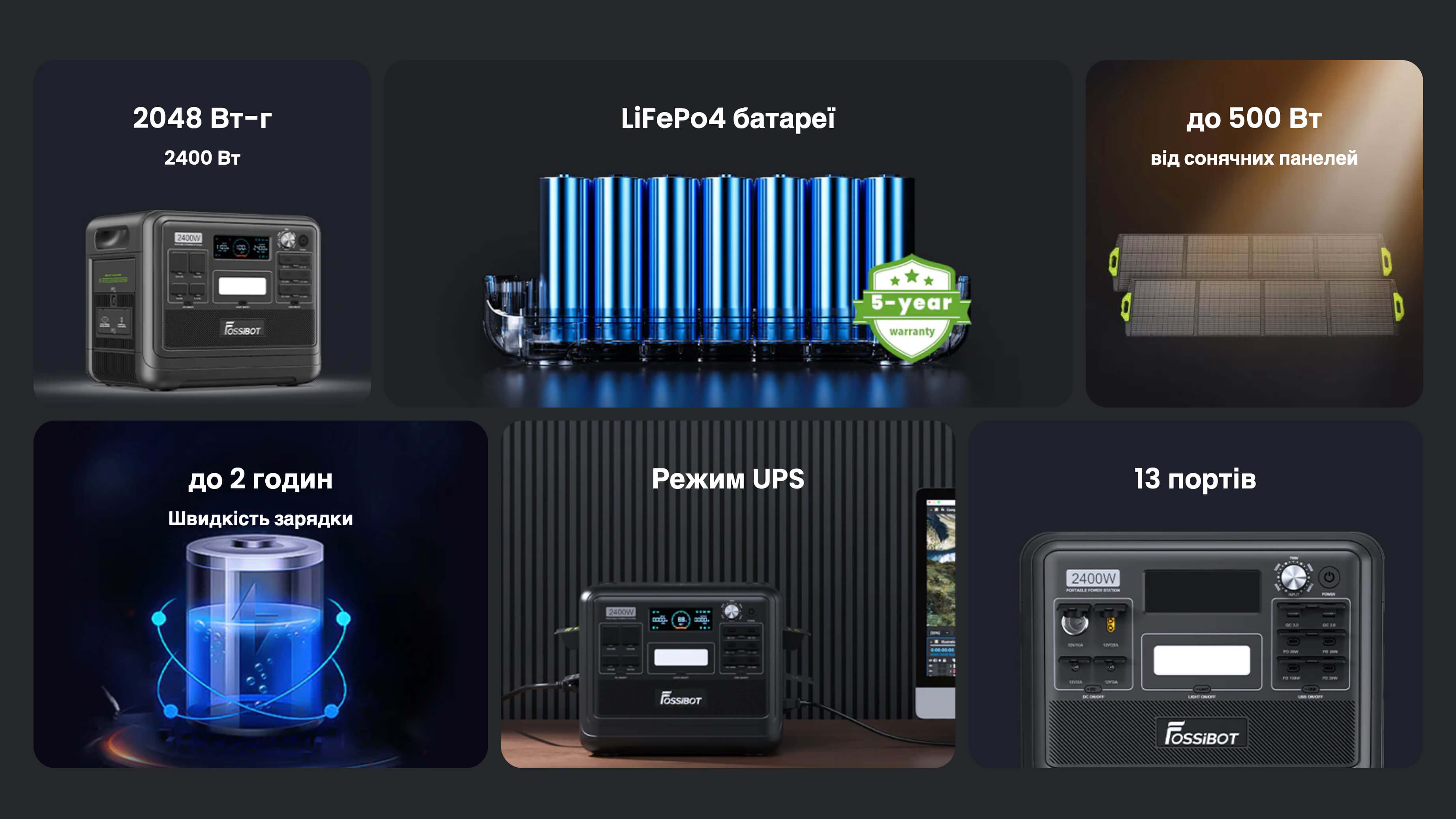 Портативная и мощная зарядная станция Fossibot - это отличный девайс, который поможет во время отключения электроэнергии, а также в условиях, когда отсутствует доступ к электросети. Данная зарядная станция имеет емкость 2048 Вт-ч и номинальную мощность на выходе 2400 Вт из розетки 220 В. Идеальный источник резервного питания, поскольку он может работать даже с тяжелой бытовой техникой: бойлер, котел, чайник и многое другое. Кроме того, за счет мощного двустороннего инвертора Fossibot F2400 обладает технологией сверхбыстрой зарядки, достаточно всего 2 часов от сети 200 В, чтобы получить 100% емкости. Специальный регулятор мощности заряда позволит ограничить нагрузку при необходимости. Оснащена износостойкими и мощными аккумуляторами нового поколения LiFePO4 (литий-железо фосфатные), которые имеют преимущества перед литий-ионными в виде меньшего веса, увеличенного количества циклов перезарядки с минимальными температурными выделениями. Может выступать в качестве источника бесперебойного питания (ИБП) для защиты и безопасной зарядки чувствительных электрических устройств. Электростанция поддерживает зарядку от любых солнечных панелей мощностью 11,5-50 В до 500 Вт. Возможность зарядить станцию от стандартной розетки, солнечных батарей, автомобильного зарядного устройства или другого генератора энергии. На корпусе есть 13 универсальных портов, чтобы обеспечить питание всем гаджетам одновременно.