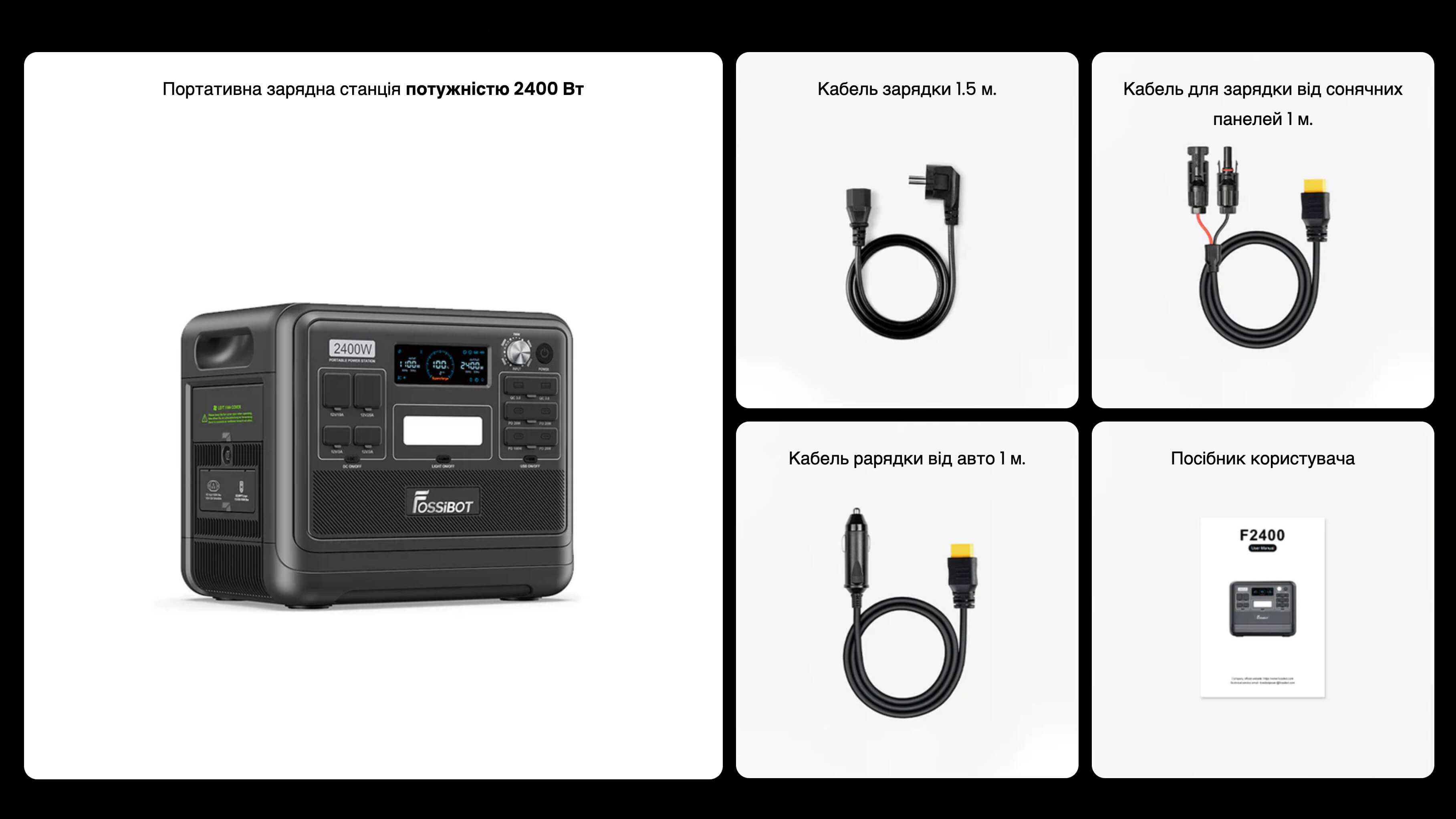 В комплектацию к зарядной станции входит: 1. Электростанция Fossibot F2400 / 2. Кабель для зарядки от сети переменного тока / 3. Кабель для зарядки от автомобильного прикуривателя / 4. Кабель для зарядки от солнечных панелей / 5. Руководство пользователя.