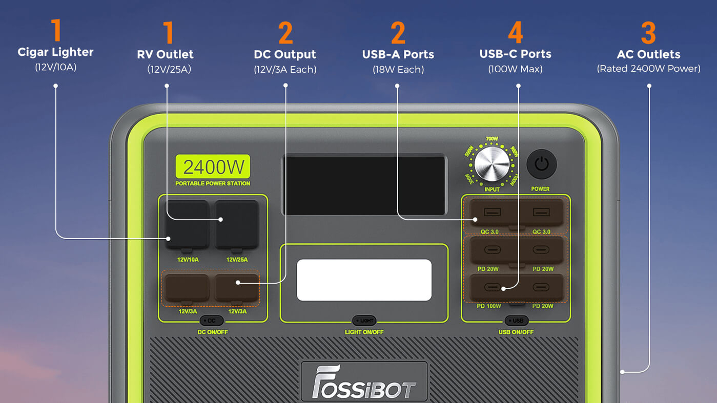 Портативная и мощная зарядная станция Fossibot - поможет во время отключения электроэнергии, а также в условиях, когда отсутствует доступ к электросети. Качественная зарядная станция должна отличаться разнообразием портов подключения, чтобы использование было максимально комфортным. В этой портативной электростанции есть несколько вариантов для зарядки: от домашней сети 220 В, от автомобиля или от солнечных батарей. Fossibot F2400 совместима практически со всеми солнечными панелями мощностью до 500 Вт. На выходе еще больше вариаций подключения потребителей: USB-порты, USB-C с поддержкой «Павер Деливери», порты для подключения слаботочных систем, таких как роутер или светодиодная лента, аналог автомобильного прикуривателя, и конечно розетки 220 В.