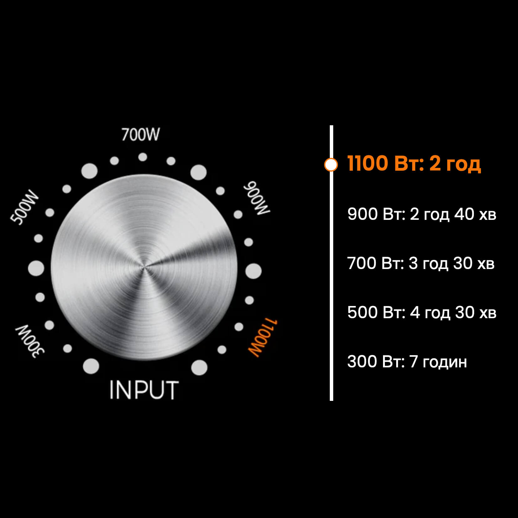 Девайс предлагает 5 режимов регулировки входной мощности зарядки. Это позволяет изменять входную мощность на 300 Вт, 500 Вт, 700 Вт, 900 Вт и 1100 Вт, что также определяет скорость зарядки станции. Если вы спешите, можно использовать сверхбыструю зарядку мощностью 1100 Вт. Если станция не нужна срочно или напряжение в сети нестабильно, вы можете отрегулировать входную мощность с помощью круглого регулятора на корпусе. Если вы хотите использовать другие электрические бытовые приборы во время зарядки станции, вы можете уменьшить потребляемую мощность для зарядки станции, чтобы мощность 1100 Вт от сети имела дополнительную электроэнергию для питания ваших устройств. Эта ручка регулировки позволяет использовать обычные электроприборы во время зарядки с меньшей входной мощностью.