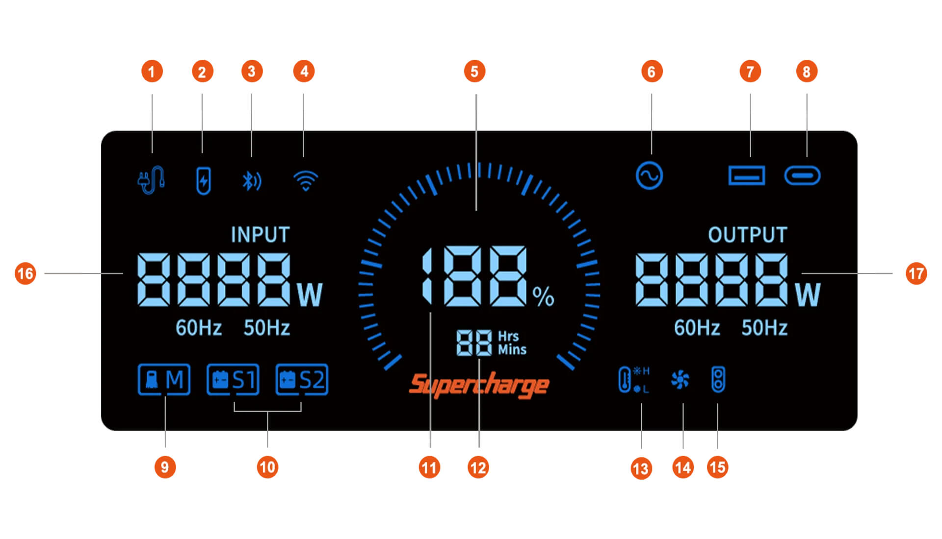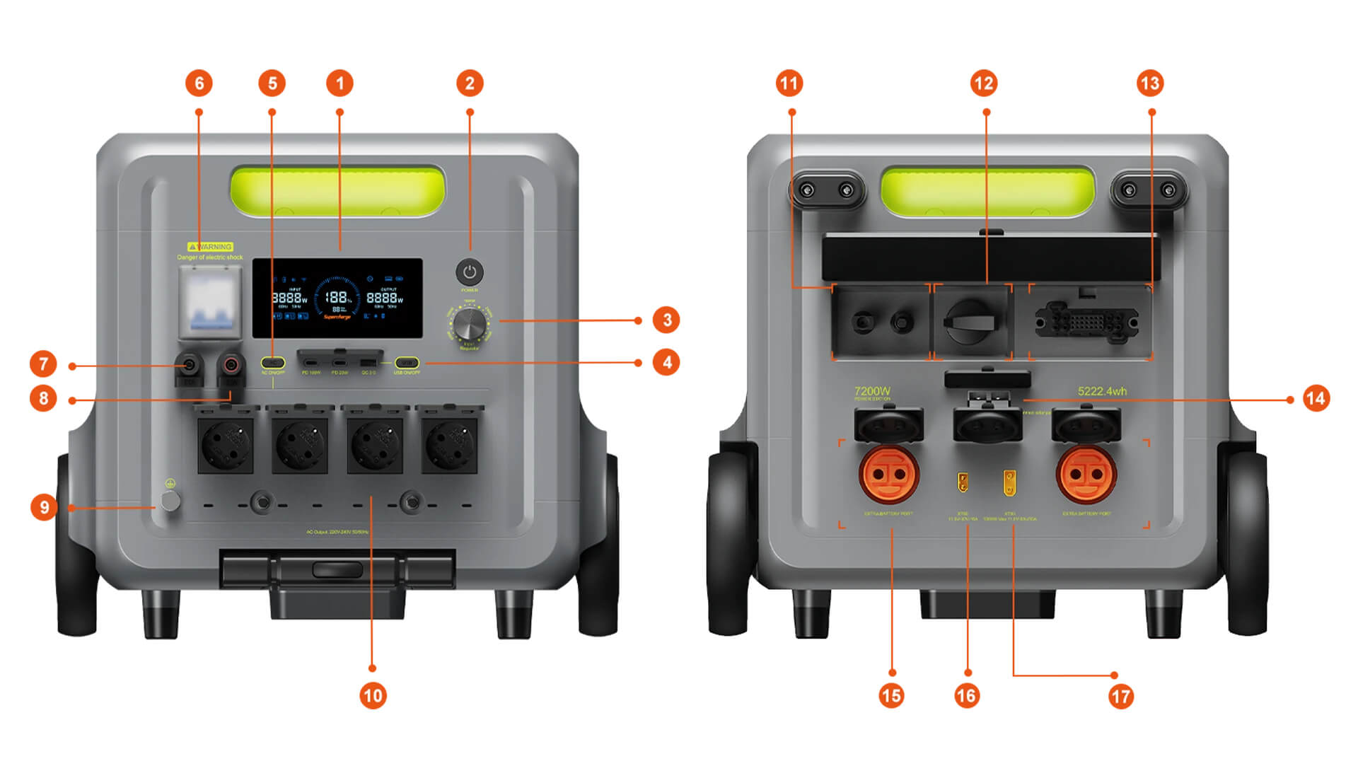 Розетки змінного струму: 4 x номінальна потужність змінного струму 7200 Вт (По 3600 Вт на кожну пару розеток); Клеми для підключення до електрощита: 7200 Вт; Порти USB-C: 1 x PD20W, 1 x PD100W; Порти USB-A: 1 x QC3.0 18 Вт; |
