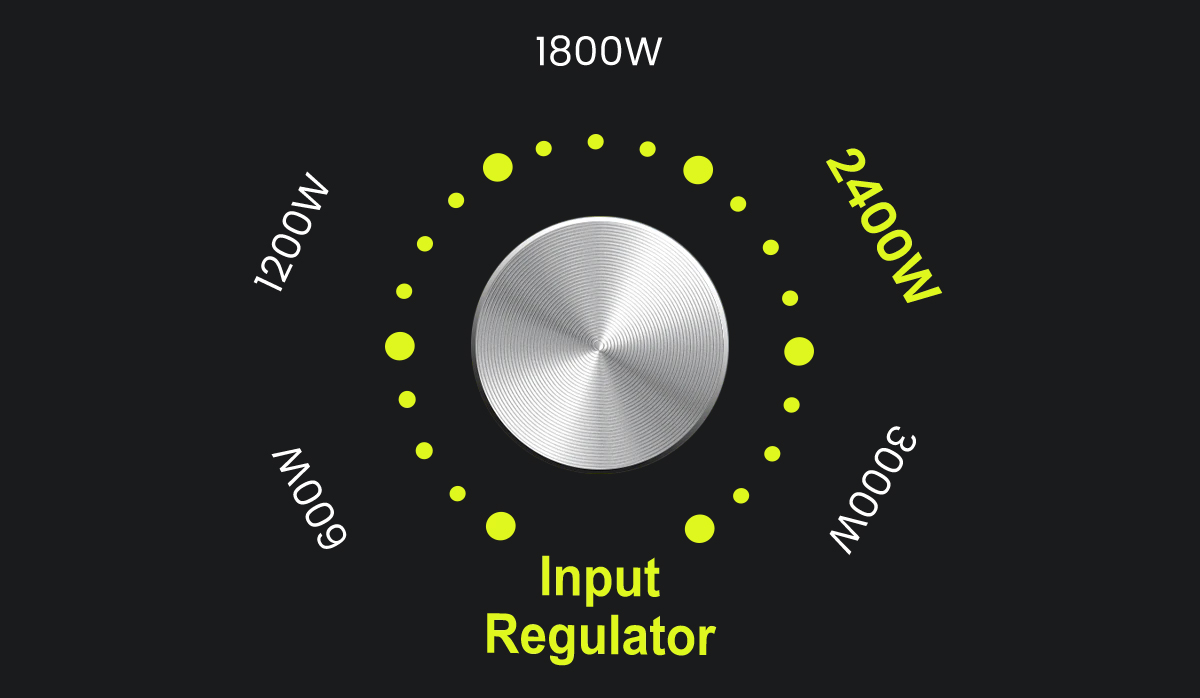 Девайс имеет специальный регулятор, который предлагает 5 режимов регулировки входной мощности зарядки. Это позволяет изменять входную мощность на 600 Вт, 1200 Вт, 1800 Вт, 2400 Вт и 3000 Вт, что соответственно определяет скорость зарядки станции. Если вы спешите, можно использовать сверхбыструю зарядку мощностью 3000 Вт. Если станция не нужна срочно или напряжение в сети нестабильно, вы можете отрегулировать входную мощность с помощью круглого регулятора на корпусе. Если вы хотите использовать другие электрические бытовые приборы во время зарядки станции, вы можете уменьшить потребляемую мощность для зарядки станции, чтобы мощность 3000 Вт от сети имела дополнительную электроэнергию для питания ваших устройств. Эта ручка регулировки позволяет использовать обычные электроприборы во время зарядки с меньшей входной мощностью.