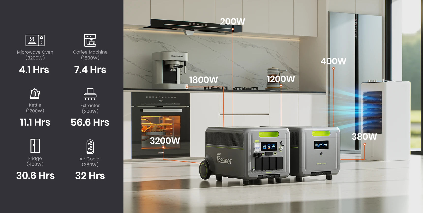 В случае с одним дополнительным аккумуляторным модулем (суммарно 10444,8 Вт-ч) можно получить следующие цифры: при питании микроволновой печи на 3200 Вт станция обеспечивает около 4,1 часа автономной работы. Электрочайник 1200 Вт работает примерно 11,1 часа суммарного времени кипячения. Холодильник с потреблением 400 Вт будет работать более двух суток — около 61,2 часа — поддерживая охлаждение продуктов. Кофемашина мощностью 1800 Вт получит около 7,4 часов общего времени работы, а кухонная вытяжка на 200 Вт — до 56,6 часов. Воздушный охладитель мощностью 380 Вт будет работать ориентировочно 32 часа.