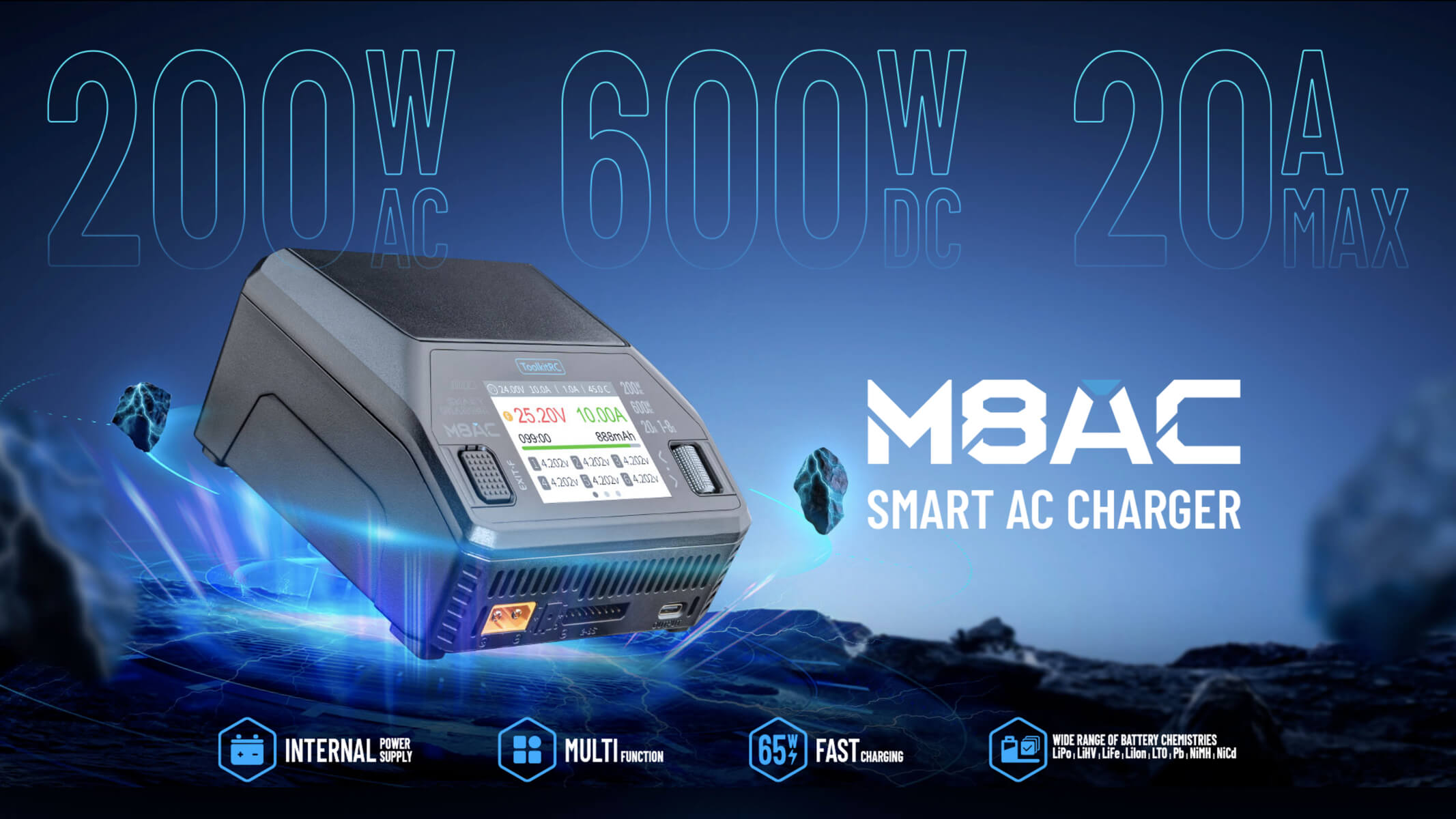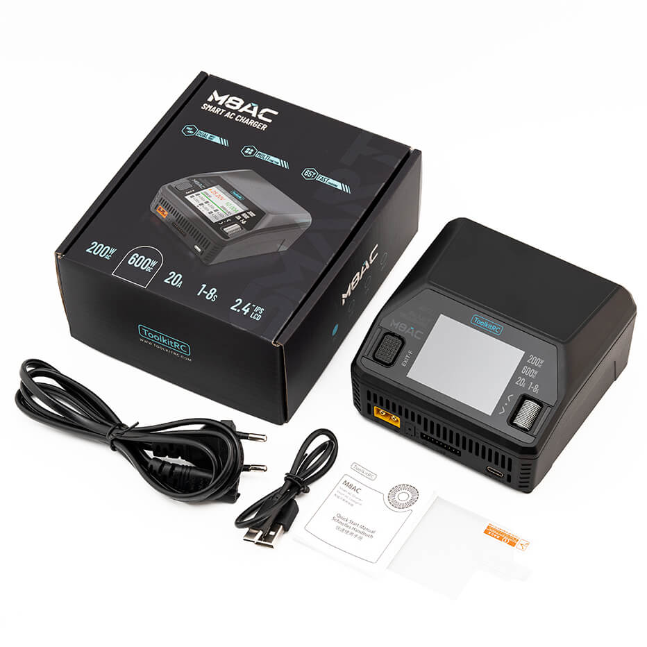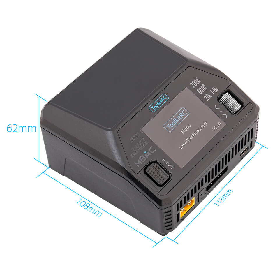ToolkitRC M8AC — це компактна, але потужна зарядна станція «все-в-одному». Працює в одноканальному режимі, для зарядки одної батареї одночасно. Поєднує вбудоване живлення, високу вихідну потужність і багатофункціональність. На відміну від багатьох зарядок, M8AC не вимагає зовнішнього адаптера — він має вбудований блок живлення на 200 Вт для роботи від мережі AC, а при підключенні до зовнішнього джерела DC розкриває повний потенціал до 600 Вт. Пристрій підтримує широкий спектр акумуляторних хімій (LiPo, LiHV, LiFe, Li-ion, LTO, NiMH, Pb) з числом осередків від 1S до 8S (для літійних), а також має балансування на рівні 1000 мА з точністю менше 0,005 В. Завдяки IPS-дисплею 2,4″, компактним габаритам (108×113×62 мм) та вазі лише 500 г, ця зарядна станція ідеально підходить як для домашнього використання, так і для польових умов.
