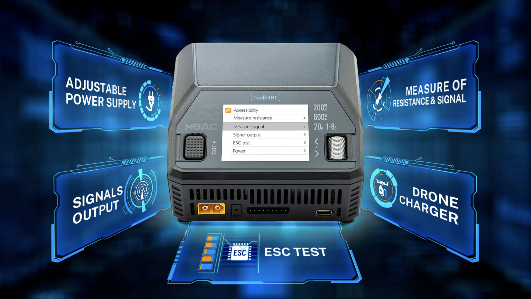 У режимі вимірювання опору M8AC дозволяє швидко визначити внутрішній опір підключеного акумулятора — ключовий параметр для оцінки його стану та ефективності. Це особливо важливо для перевірки балансування комірок перед зарядом або використанням у FPV-системах. Також доступна функція аналізу сигналів керування. Користувач може обрати тип сигналу — PWM, PPM або SBUS, — і перевірити, як передавач або приймач відпрацьовує імпульси. На екрані відображаються дані по каналах (1–8, 9–16), а також зведений статус, що допомагає швидко локалізувати проблеми в апаратурі керування.