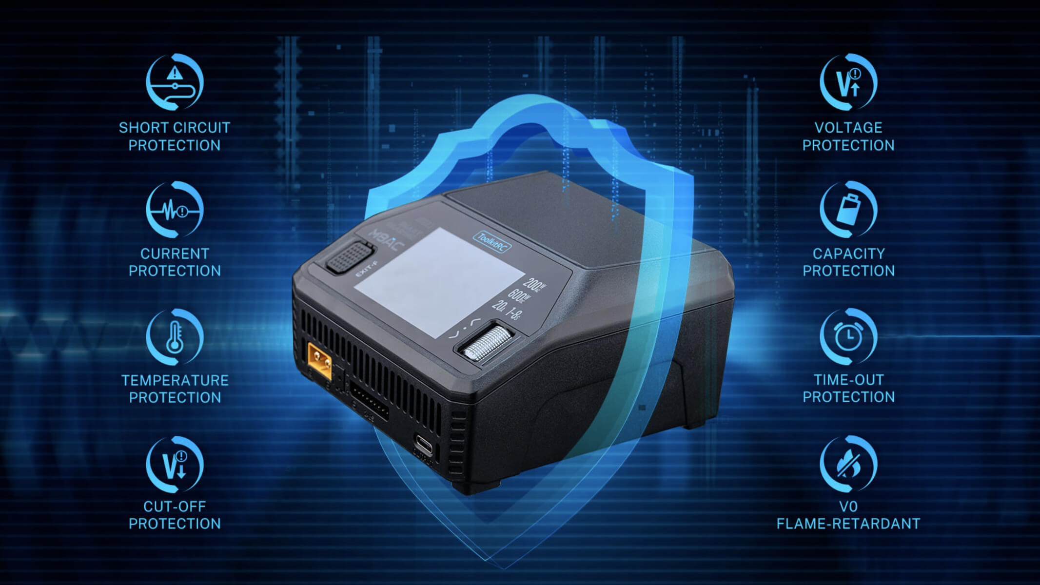Зарядний пристрій оснащений багаторівневою системою захистів, які контролюють процес зарядки та розрядки на апаратному і програмному рівнях. Це гарантує стабільну роботу пристрою навіть у стресових умовах і продовжує ресурс акумуляторів. Інтелектуальний моніторинг температури в режимі реального часу запобігає перегріву як самого зарядного, так і підключених батарей. При досягненні критичних показників система автоматично знижує навантаження або відключає канал. Захист від перенапруги та перевищення струму забезпечує безпечну роботу з різними хімічними типами акумуляторів, виключаючи ризик пошкодження елементів. Пристрій також відслідковує баланс напруги між осередками з точністю до 0,001 В, що мінімізує ймовірність перезаряду або перерозряду окремих банок. Додатково реалізовано захисти від короткого замикання, зворотної полярності та нестабільного живлення, що особливо важливо у польових умовах при використанні зовнішніх джерел DC.